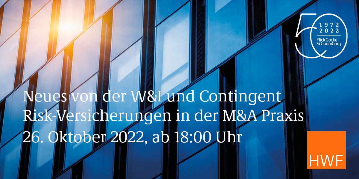 Flick Gocke Schaumburg und der Spezialversicherungsbroker HWF Partners laden Sie herzlich zum Erfahrungsaustausch „Neues von W&I- und Contingent Risk-Versicherungen in der M&A Praxis“ ein.