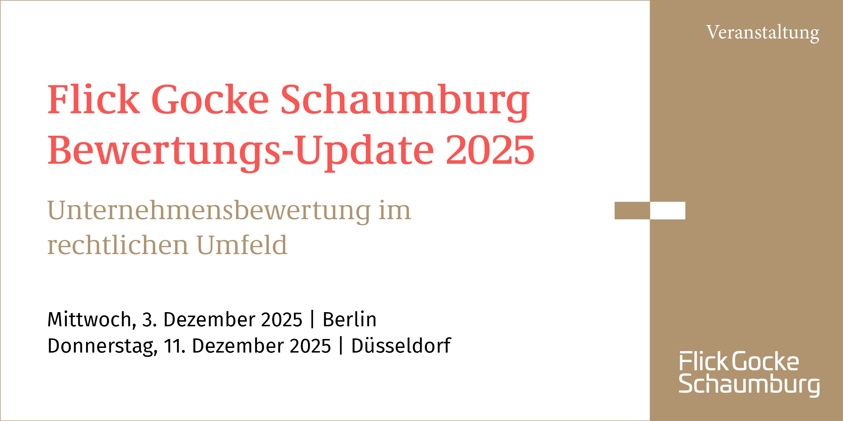 aktuelle Entwicklungen der Unternehmensbewertung im rechtlichen Umfeld stehen im Fokus der nächsten Abendveranstaltung Flick Gocke Schaumburg Bewertungs-Update | Unternehmensbewertung im rechtlichen Umfeld. Die Veranstaltung findet am 3. Dezember 2025 in Berlin und am 11. Dezember in Düsseldorf statt. Wir laden Sie heute herzlich dazu ein.